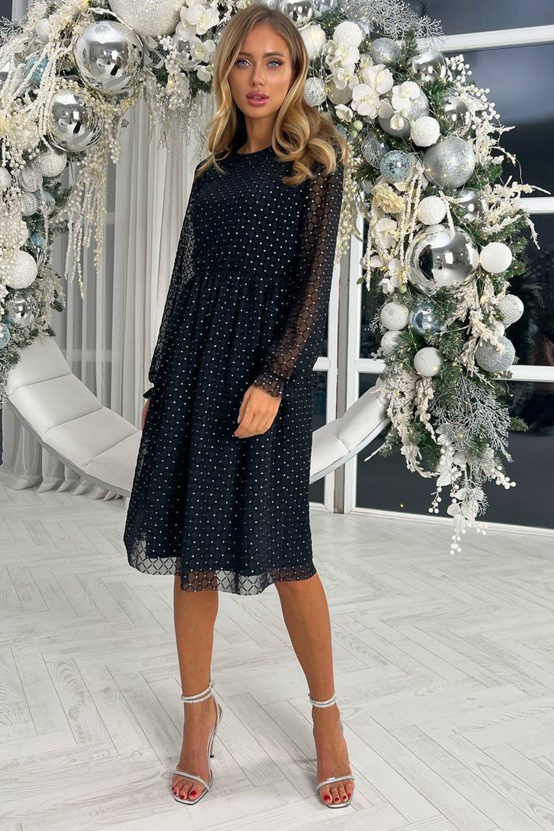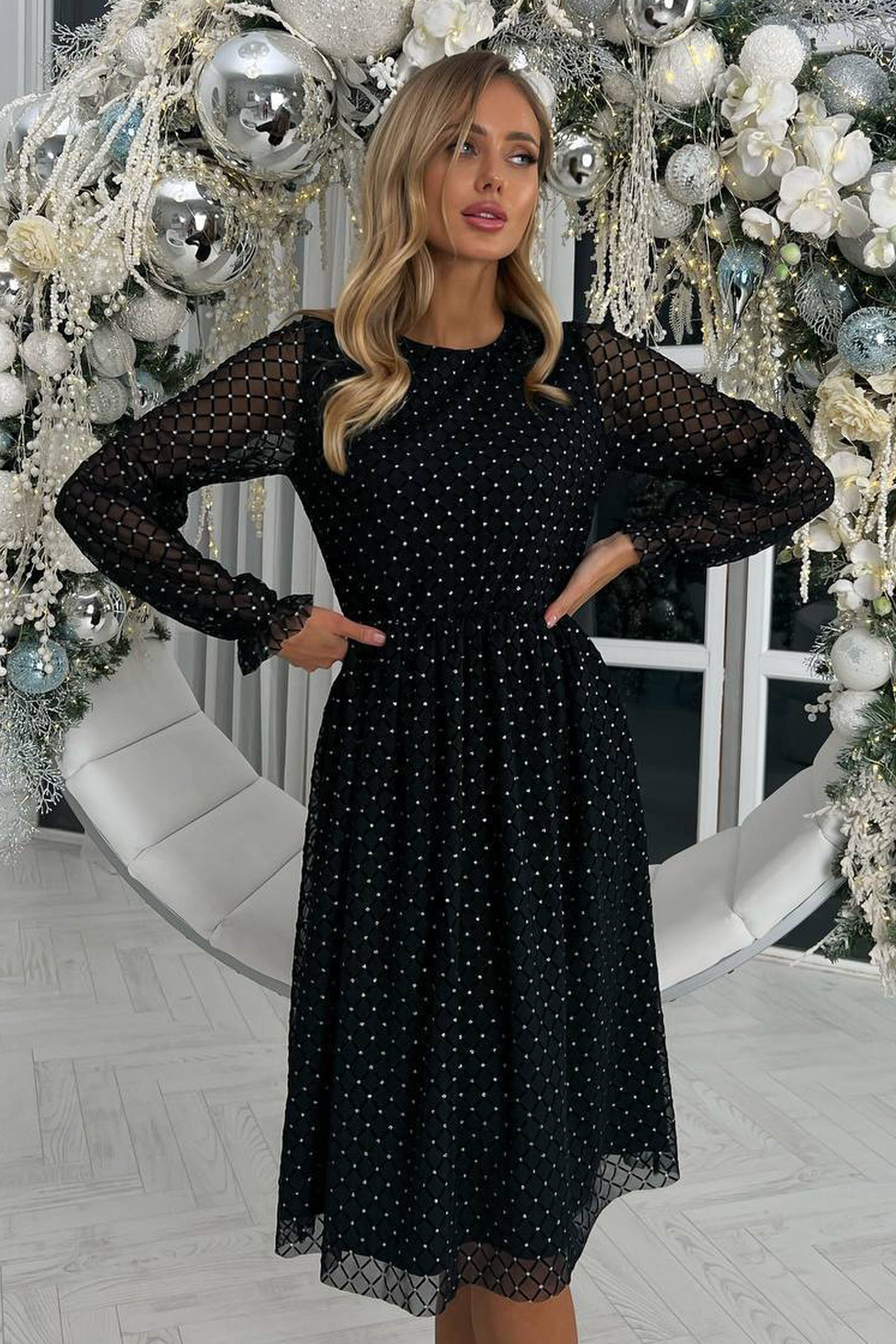 Această rochie midi, de un negru intens, cu inserții de tull și catifea în relief, este alegerea perfectă pentru a străluci la orice eveniment festiv.