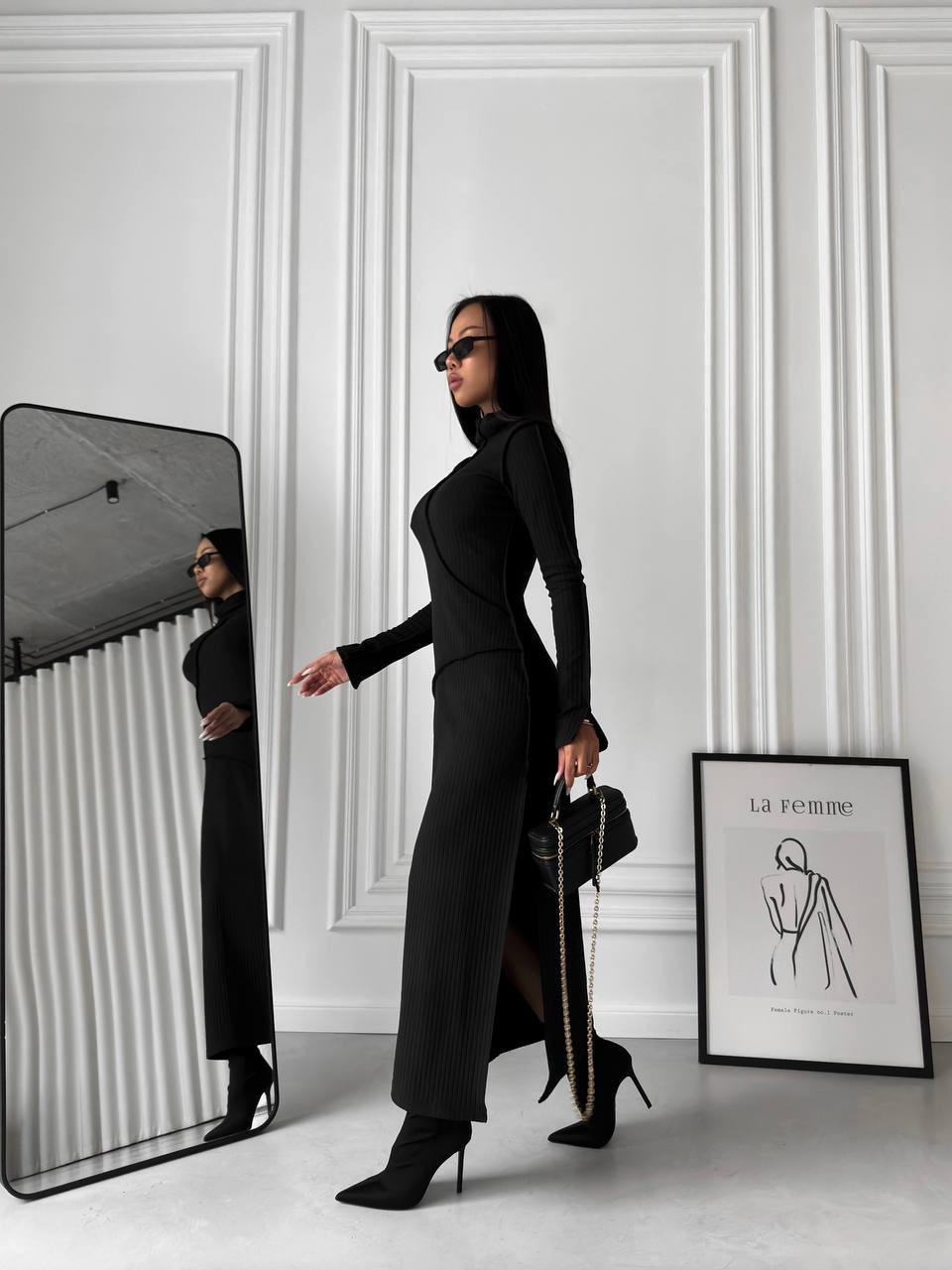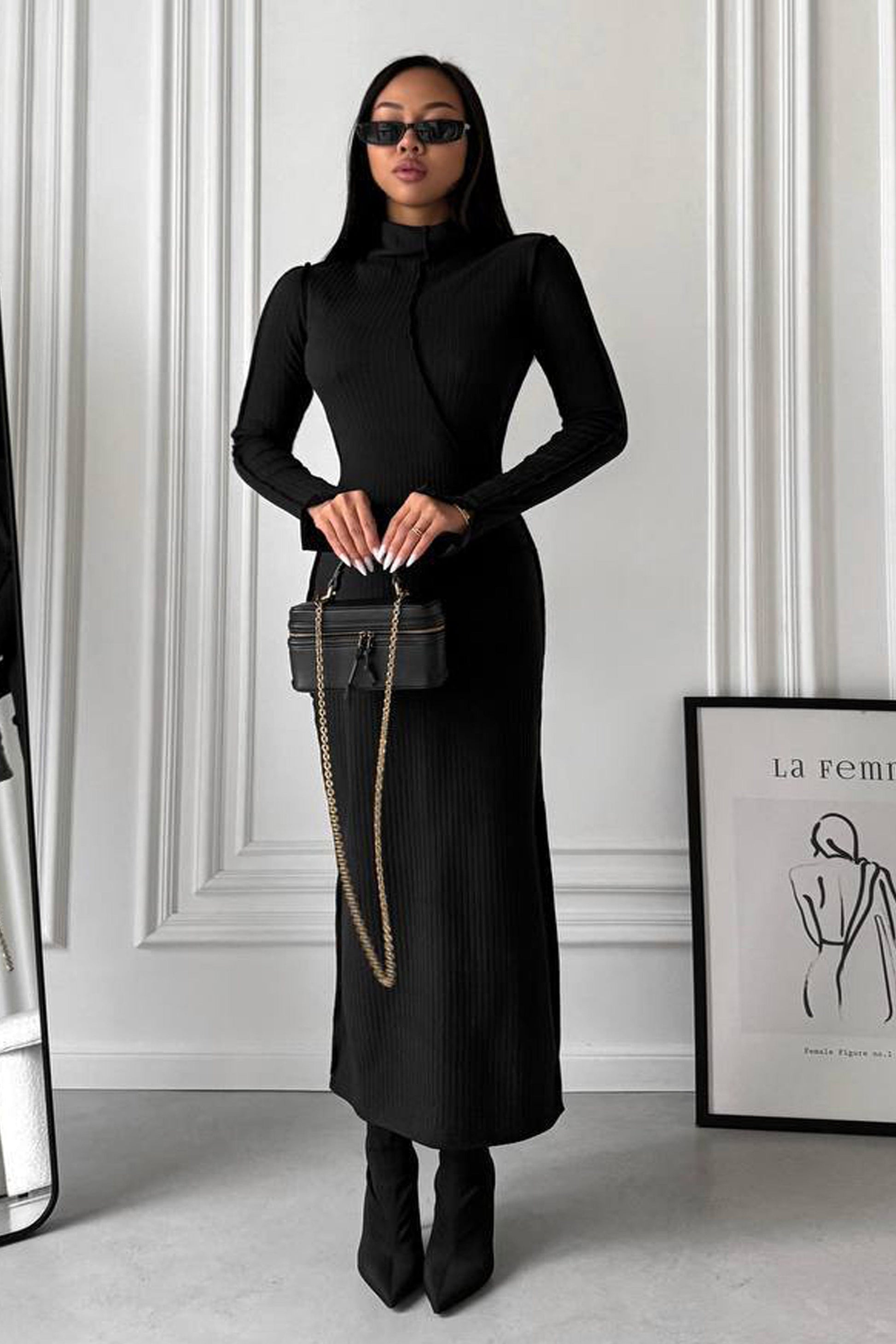 Această rochie neagră, cu croială lungă și detalii nervurate, este reinterpretarea modernă a rafinamentului minimal. Tăietura înaltă pe laterale adaugă un strop de senzualitate și dinamism, iar gulerul înalt și mânecile lungi creează un echilibru perfect între eleganță și stil urban. Materialul elastic și plăcut la atingere evidențiază armonios formele, conferindu-ți libertate de mișcare. Fie că o porți cu botine cu toc pentru un look sofisticat, sau o asortezi cu accesorii statement, Chloe îți va pune în valoare personalitatea și va capta toate privirile.